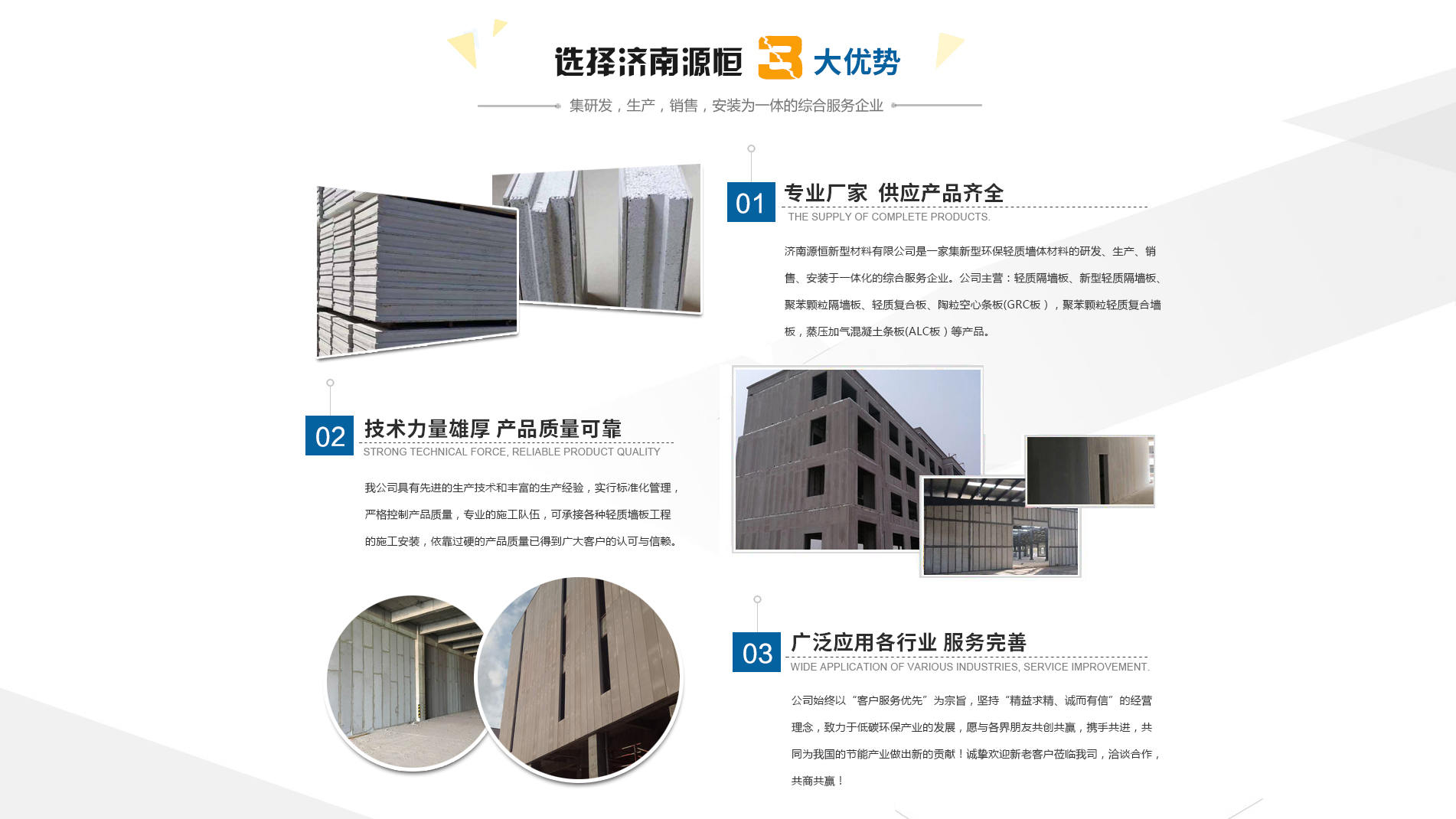 濟(jì)南源恒新型材料有限公司坐落于美麗的泉城濟(jì)南,是集新型環(huán)保輕質(zhì)墻體材料的研發(fā)、生產(chǎn)、銷(xiāo)售、安裝于一體化的綜合服務(wù)企業(yè)。我公司具有的生產(chǎn)技術(shù)和豐富的生產(chǎn)經(jīng)驗(yàn),為您提供輕質(zhì)隔墻板、新型輕質(zhì)隔墻板、聚苯顆粒隔墻板、輕質(zhì)復(fù)合板、陶粒空心條板(GRC板),聚苯顆粒輕質(zhì)復(fù)合墻板,蒸壓加氣混凝土條板(ALC板)等產(chǎn)品,本公司有專(zhuān)的施工隊(duì)伍,可承接各種輕質(zhì)墻板工程的施工安裝。輕質(zhì)隔墻板是國(guó)家推廣使用的新型輕質(zhì)、綠色無(wú)害建材,是墻改節(jié)能政策大力扶持的環(huán)保節(jié)能產(chǎn)品,是發(fā)達(dá)國(guó)家普遍采用的新型墻體材料。濟(jì)南源恒新型材料有限公司實(shí)行標(biāo)準(zhǔn)化管理,嚴(yán)格控制產(chǎn)品質(zhì)量,依靠過(guò)硬的產(chǎn)品質(zhì)量已得到廣大客戶的認(rèn)可與信賴。公司產(chǎn)品遍布各大城市,與國(guó)內(nèi)多家客戶建立了良好的合作關(guān)系。公司始終以“客戶服務(wù)優(yōu)先”為宗旨,堅(jiān)持“精益求精、誠(chéng)而有信”的經(jīng)營(yíng)理念,致力于低碳環(huán)保產(chǎn)業(yè)的發(fā)展,愿與各界朋友共創(chuàng)共贏,攜手共進(jìn),共同為我國(guó)的節(jié)能產(chǎn)業(yè)做出新的...